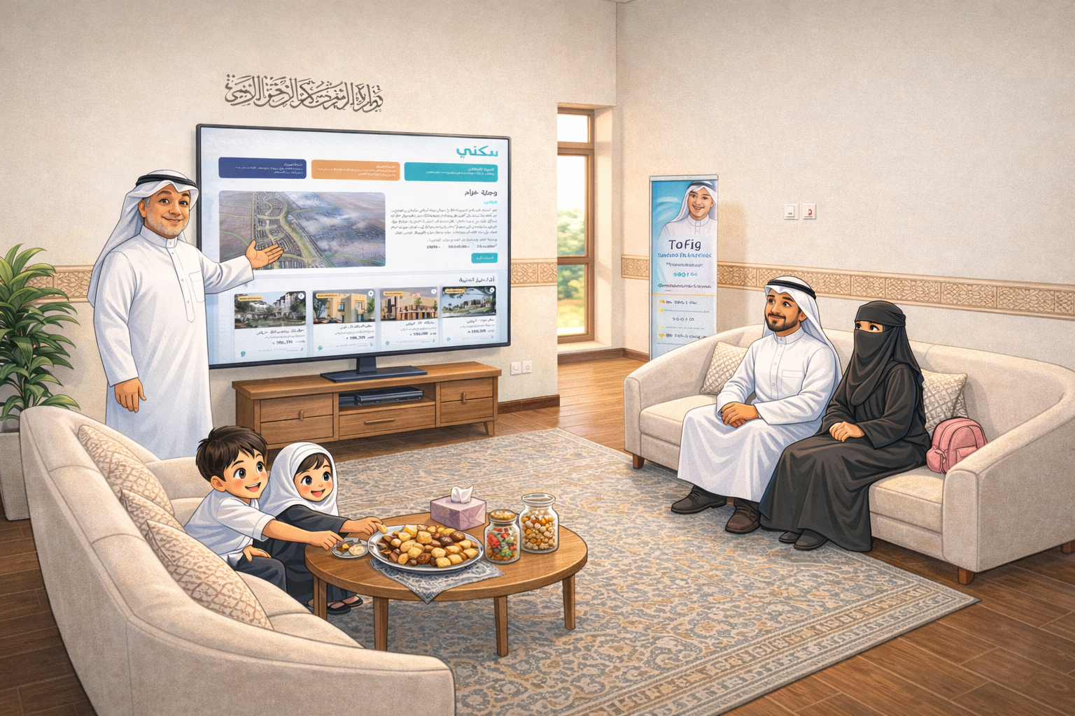 توفيق: (يضحك) أبشري يا نوره، الحين بنشوف كل شي. شوفوا يا جماعة، هذا موقع سكني sakani.sa. الوصول له سهل، تقدرون تدخلون من المتصفح أو تحملون التطبيق، وتسجلون دخولكم عن طريق النفاذ الوطني الموحد، وكل شي بيطلع قدامكم واضح.